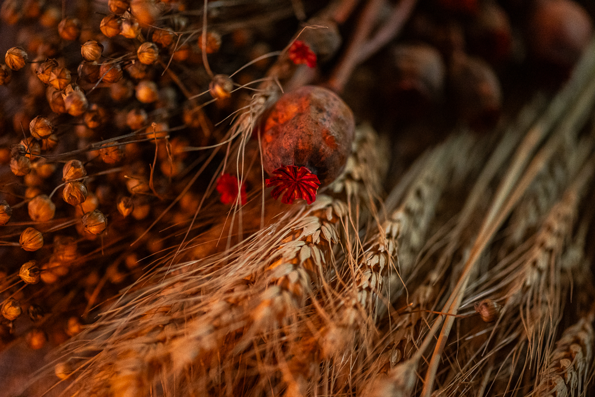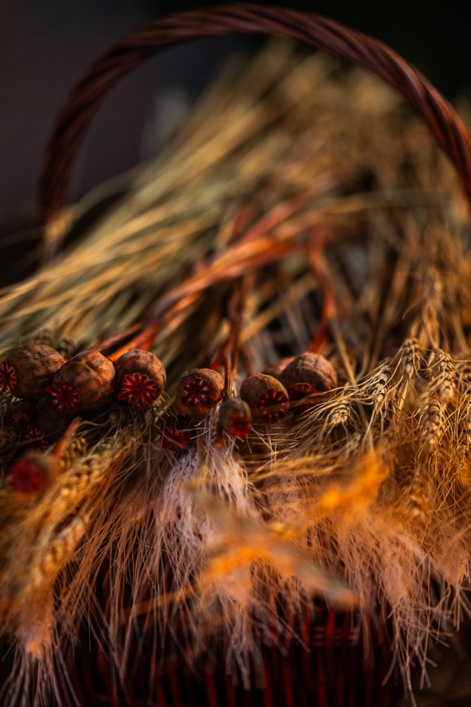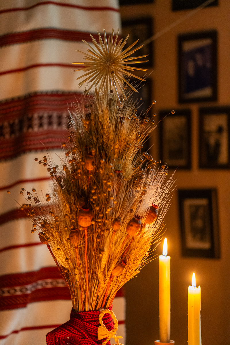 I am still learning the many ways to make a Didukh so ours is simple – a sheaf rather than a tree. I add linum meant to ward off the evil and dry poppy pods to protect from headaches. After I am done, I place it at the head of the table, under my grandmother’s rushnyk and black-and-white photos of our parents and grandparents. I call on them to come visit and bring their stories.