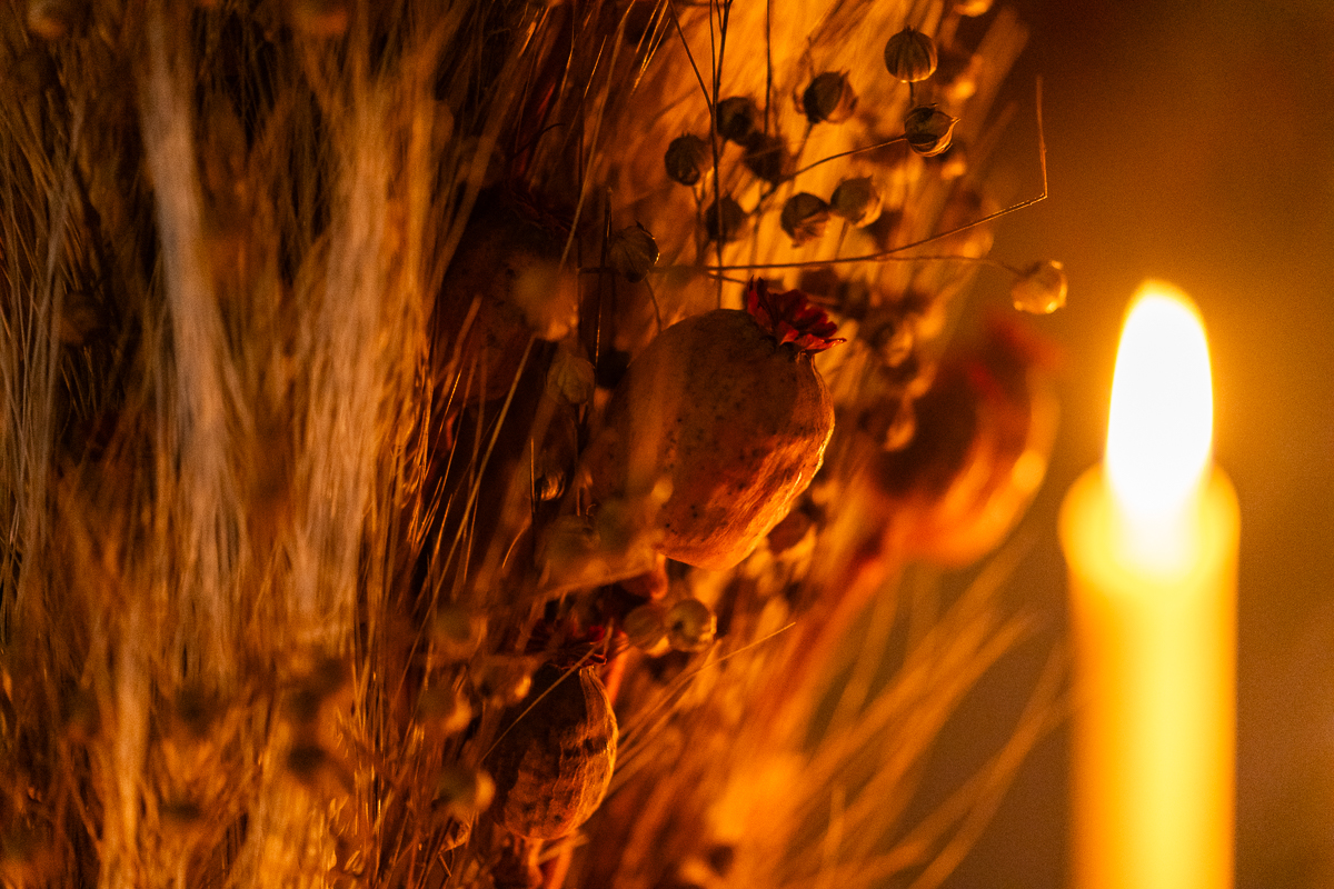 As transitions between seasons become increasingly porous, I hold on to the ancient ritual of making a Didukh. I revel in the heaviness of a wheat sheaf in my hands, an embodiment of nature’s cycle condensed into hard, oval seeds swaddled in dry husks. The tiny kernels chant of summers past and those yet to come. They rustle of autumnal crispness and whisper of winter’s lull. All the songs that will soon be poured into new plants. As I build a Didukh with my family during the winter solstice, I return to its roots of celebrating the eternal rebirth of light. I tap into my ancestors’ wisdom and their reverence of the Sun – the life-giving force, a celestial keeper of Earth’s rhythm, a spotting point in our constantly shifting world.