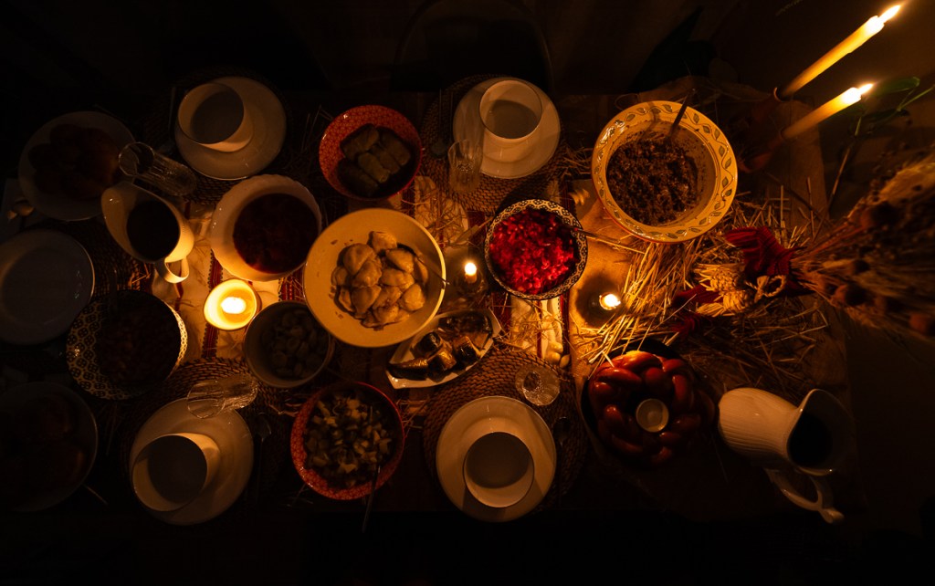 The name “Didukh” means “Grandfather’s Spirit”. It signifies connections between generations, a connection that is reinforced through many different practices during this time of the year. People often visit the cemetery on Christmas Eve and light candles on the graves of their loved ones. In some parts of Ukraine, it is customary to lightly blow on chairs and benches before sitting down – to avoid planting yourself on top of any spirits. There’s always an extra plate set for our departed relatives, and the food is kept on the table overnight so they can feast after everyone goes to bed.