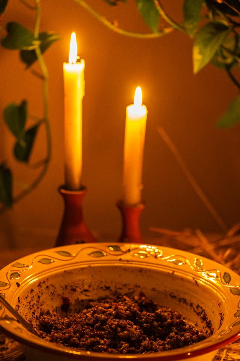 It is customary to make twelve dishes for the Christmas Eve dinner, all cooked from simple plant-based ingredients. Honey and fish are the only exceptions. While the types of dishes may vary depending on the region, every Christmas Eve dinner starts with Kutia. Made with wheat berries, ground poppy seeds, walnuts, honey, raisins or dried fruit, this ritual dish symbolizes our connection with the world of the dead. In addition to Christmas, Kutia is also served during wakes.