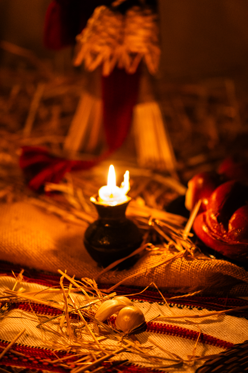 After placing Didukh in the corner, my grandfather would bring a bale of hay into the house, spread it on the floor and put some on the table. According to ancient beliefs, it guaranteed prosperity in the new year; for my brother, my cousins and me, it was an invitation to jump and roll around. With no access to fields of grass in Toronto, we try to pick some hay and straw during our visits to the farm. It is not enough to cover the floor of our apartment but sufficient to put on the table. Cloves of garlic placed in four corners are meant to ward off sickness.